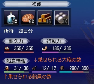 船には耐久力(HPとほぼ同義と思ってください)、旋回速度、乗せられる船員や大砲の数、