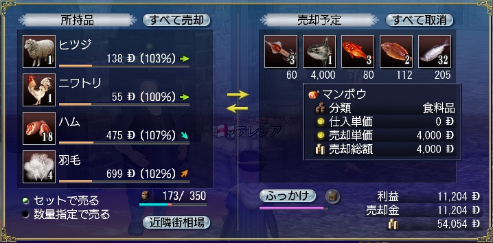 ニワトリ1羽を交易所で買うと40~60D、オリーブ1樽なら200~300D(だったはず)。